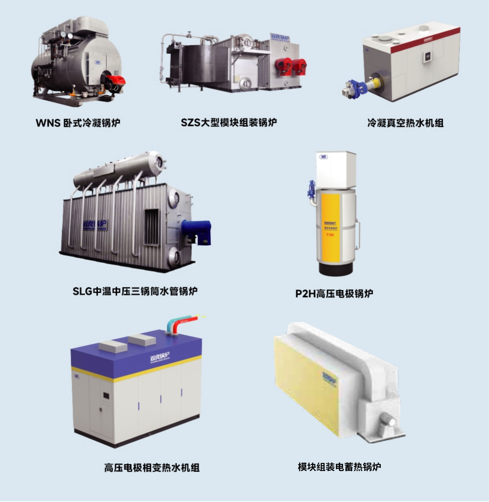 WNS臥式冷凝鍋爐、SZS大型模塊組裝鍋爐、冷凝真空熱水機組、SLG中溫中壓三鍋筒水管鍋爐、P2H高壓電極鍋爐、高壓電極相變熱水機組、固體蓄熱機組、低壓電阻系列鍋爐(真空熱水機組、蒸汽鍋爐、熱水鍋爐)、電化學儲能、水蓄熱系統等。