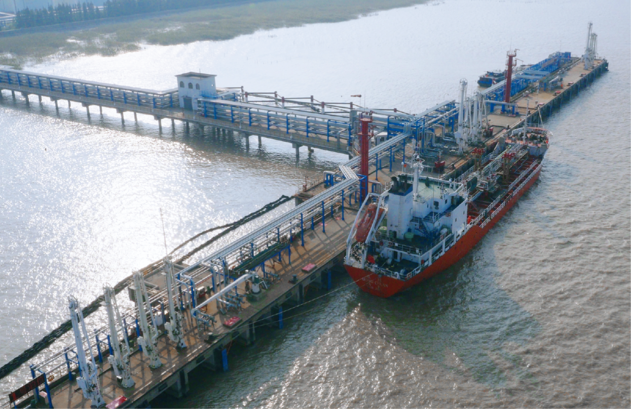 占地面積42萬平方米,主要從事石油化工產品的倉儲服務貿易。公司依托3萬噸級(兼靠5萬噸級)化工碼頭,分三期建成40萬m3化工倉儲罐區,主要從事乙烯、苯、苯乙烯、丁二烯、乙苯,年周轉量可達到150 萬噸以上。